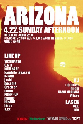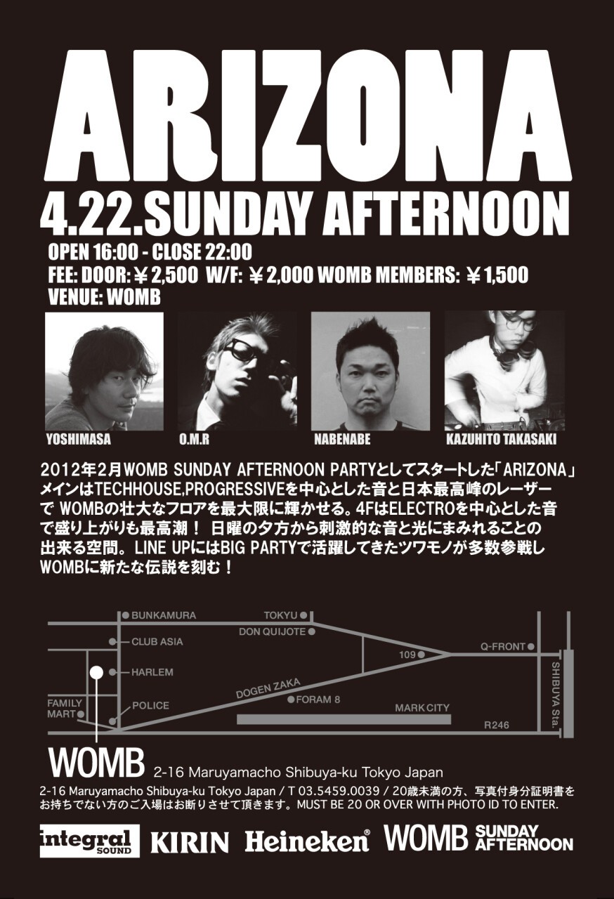 2012年2月WOMB SUNDAY AFTERNOON PARTYとしてスタートした「ARIZONA」 メインはTECHHOUSE,PROGRESSIVEを中心とした音と日本最高峰のレーザーで WOMBの壮大なフロアを最大限に輝かせる。4FはELECTROを中心とした音で盛り上がりも最高潮! 日曜の夕方から刺激的な音と光にまみれることの出来る空間。 LINE UPにはBIG PARTYで活躍してきたツワモノが多数参戦しWOMBに新たな伝説を刻む!
