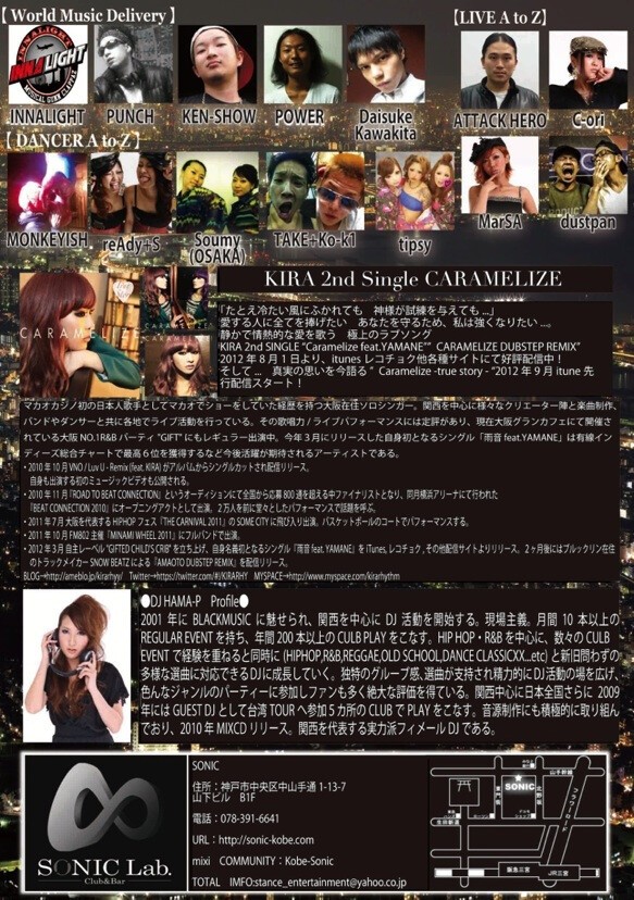 そして今回は関西を代表するDIVAであり、東京を始めとした全国各地はもちろん、世界を股にかけるSINGER [KIRA]の2nd Single『Caramelize』RELEASE LIVEと、地元大阪を中心に各地で幅広い層から人気があり毎週多数のPARTYにレギュラー出演しオーディエンスを沸かしている『DJ HAMA-P』がGUEST SPIN!!!