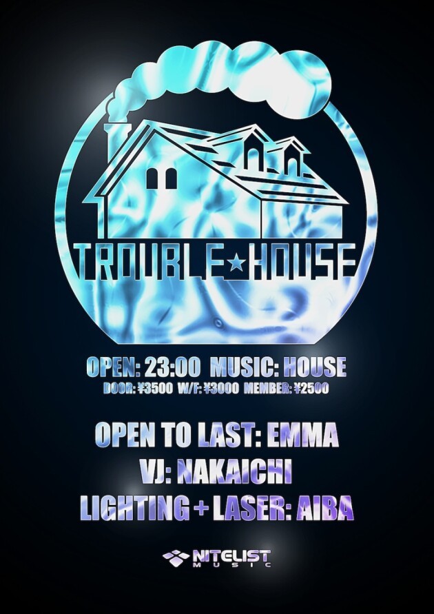 9月に9周年を迎える、音楽と照明そして映像のコラボレーションというテーマから生まれた EMMA によるWOMB マンスリーレジデントパーティー TROUBLE HOUSE。EMMA が毎回オープンからラストまで渾身のロングプレイを披露。ライティングは既に EMMA のプレイには欠かせない存在となっている盟友 AIBA、ビジュアルは YOSHIAKI NAKAICHI が担当。回を重ねて培ってきた息のあったプレイは毎回このパーティーでしか体感出来ない素晴らしい空間を作り出している。最新情報は TROUBLE HOUSEフェイスブックをチェック!