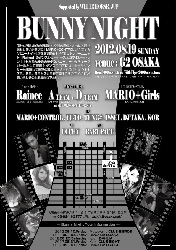 【BUNNY★NIGHT TOUR 2012】 7/15(SUN) OSAKA STAGE@G2 OSAKA 8/10(FRI) MATSUYAMA STAGE@CLUB BIBROS 8/19(SUN) OSAKA STAGE@G2 OSAKA+AFTER PARTY@LAMPOON 8/25(SAT) KOCHI STAGE@DAHLIA 8/31(FRI) KOBE STAGE@CLUB EIGHT 9/8(SAT) OKAYAMA STAGE@SOUL TRAIN 9/16(SUN) OSAKA STAGE@G2 OSAKA+AFTER PARTY@WHITE HORSE 9/28(F...
