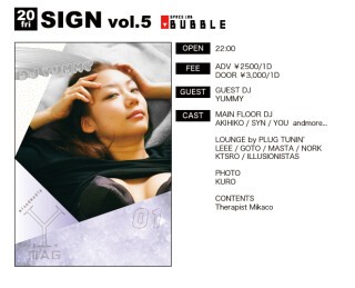 SIGN Vol.5となる今回は『RED』がキーワード!『RED〜赤〜』のアイテムを身に着けてご来場された方には 【SIGNオリジナルシャンパンカクテル】をプレゼント致します。Guestには【DJ YUMMY】を招聘。今最も勢いのある実力派として注目されるYUMMY。7/4発売のPhoto art book w/mixCD 『Y.mag』のリリースツアーで地元水戸での凱旋公演!!