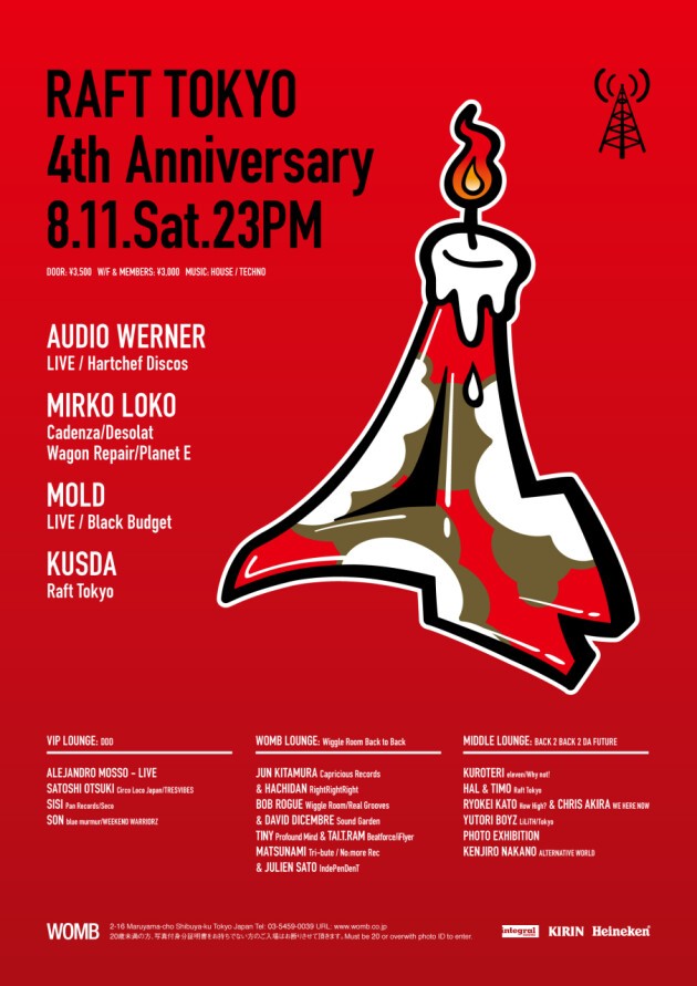 昨年8月の3周年には、Octave One を招聘し記録的な盛り上がりをみせた Raft Tokyo の4周年のパーティーが再びWombで開催される。4周年のゲストに彼らが選んだのはPerlonやHello? Repeat、Circus Company、Trapez等で良質なリリースを続けるAudio Wernerと、現在Luciano率いるCadenzaでの活躍も目覚しく、Vision Questからのリリースも話題のMirko Loko、そして前回のRaft Tokyoに出演したErnesto Ferreyraの盟友Alejandoro Mossoが登場する。国内からは先日のBig Beach Festivalのメインフロアにも出演したSatoshi OtsukiやJSDとRAYMOND兄弟によるユニットMOLDがLIVEにて出演。Middle LoungeとWomb Loungeでは今もっとも勢いのあるアーティスト達のBack to Backでのプレイが行われ、全フロア見逃すことのできない内容となっている。彼らが走り続けた四年間の集大成はどのように表現されるのか。この記念すべき祝祭を最高のエレクトリックミュージックと共に祝おう!