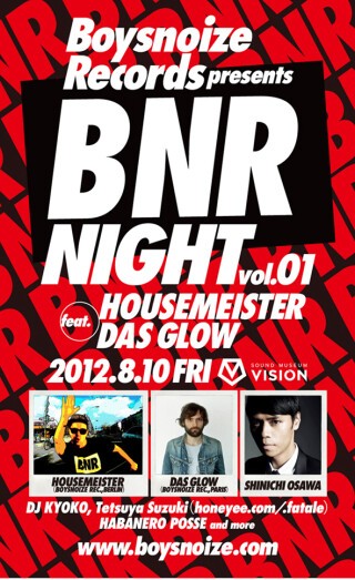 エレクトロニック・ミュージック界のスーパースター:BOYS NOIZEが主宰するBoysnoize Recordsが、なんと日本でオフィシャル・イベントを始動する。その第一弾を飾るのは、テクノ/エレクトロにゲットーワイズなサウンドを注入し、“テクノBボーイ”との異名を持つHOUSEMEISTER。そして、DAFT PUNK系統のディスコ・サウンドからディープなテクノまでを操るDAS GLOWが駆けつける。さらに国内からは、BOYS NOIZEが“SINGAPORE SWING”を好んでプレイするほど、才能を高く評価している大沢伸一が登場。エレクトロの遥か先をゆく実力派アーティストが、『BNR NIGHT』を激しく揺らす!