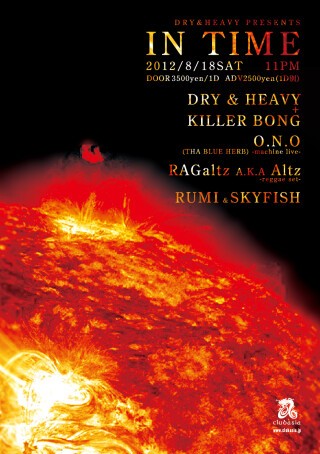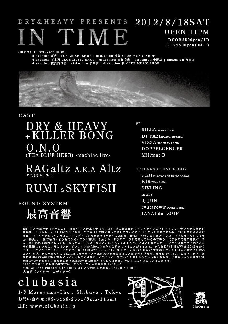 そんなDRY&HEAVYが2012年からスタートさせたイヴェント、その名も〈DRY&HEAVY PRESENTS IN TIME〉。DRY&HEAVY主催のイヴェントは何と初めての試みだというが、その点からもここに込められた秋本と七尾の思いを感じ取ることができるだろう。言うまでもなく、このパーティーは単に出演者の名前で客を集めようとするものではない。このメンバーだからこそ生まれるだろう特別な空間。それはジャンルも世代も越えたものであって、首謀者の秋本は東京の夜に起爆剤(もしくは劇薬)を投下しようとしているのだろう。