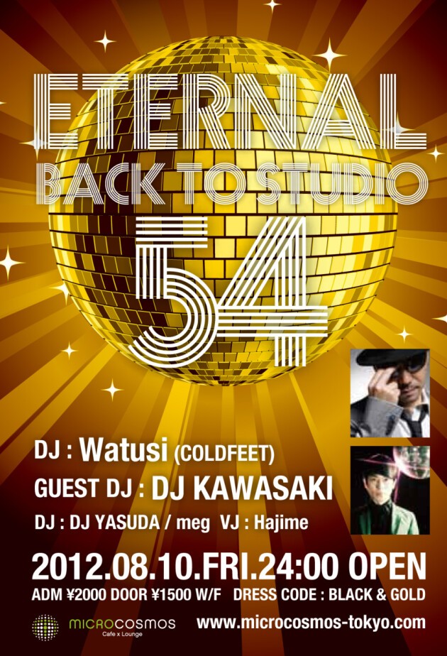 WatusiがSpecial Guestsと共に永遠に輝ける名曲を独自の解釈で“new classics”として世に問い直す。オリジナル時代の輝きも、グローバル・トレンドも咀嚼した大人達の集い、それが “ETERNAL”。今回はDance Classicsの名曲をカバーしたアルバム「BLACK&GOLD」、そしてそのオリジナルをMixしたアルバム「MAGIC」をリリースした ばかりのDJ KAWASAKIをフィーチャ。70’s DISCO 当夜はそうした今、改めてムーブメントとなっているDance Classics?Disco Boogieの名曲達を集めて70'sのNYCを華やかに彩ったDisco “Studio 54”の夜を蘇らせる、真夏の夜に相応しい一夜限りのスペシャル・パーティ。
