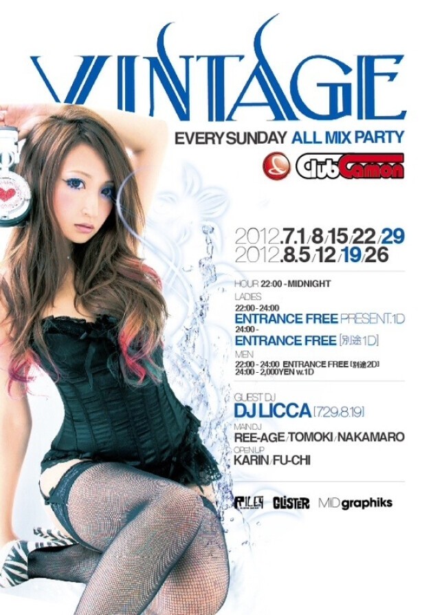 【毎週日曜オールジャンル】話題沸騰!!日曜カモンは毎週大盛況のオールミックスパーティー『VINTAGE』☆☆24時まで男女入場無料&女性は1Dプレゼント★★24時以降もmixi割で超お得♪