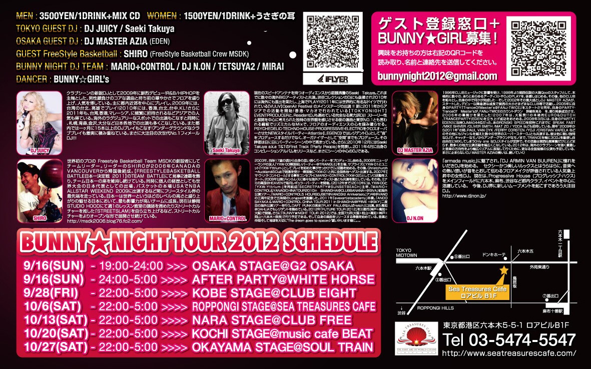 2012年【FUTURE TOUR 2012】を三都市(神戸+高知+大阪)さらに【BUNNY★NIGHT TOUR 2012】では、全国7カ所(大阪+松山+高知+神戸+岡山+六本木+奈良)でPRODUSER兼DJとして開催。