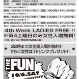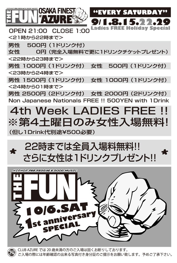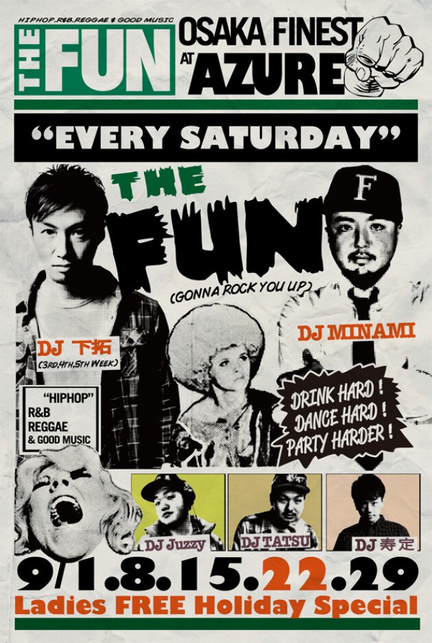 知らない人は無し、大阪いち有名なこの場所この曜日この時間。SOUL FOOD、SATURDAY AZUREに続く、毎週土曜日の新定番パーティー『THE FUN』が、2011年10月より始動!DJ MINAMI & DJ 下拓の、揺るぎないツートップは勿論、アーリータイムから、HipHopを中心にR&BやReggae、また近年のチャートを賑わすダンスチューンなど幅広い選曲が楽しめます!関西クラブ遊びの登竜門とも言える『土曜日のアズール』には、本当に色んな人が遊びに来ており、毎週来ても新たな音楽・お酒・友達と出会える、チェック必至のパーティーです!出会いの秘訣は、何より“楽しむ”こと!週末土曜日の夜を素敵なものにしたいパーリーピーポー達よ!JUST HAVE FUN!!