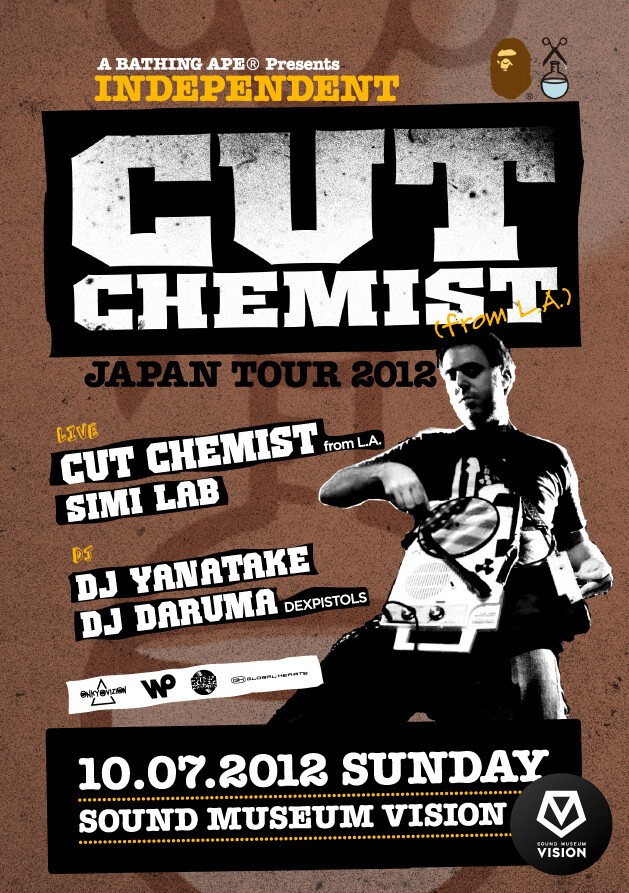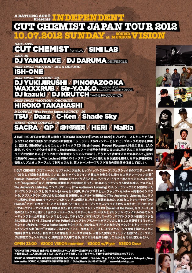A BATHING APE が贈る秋の祭典!BAPE?の歴史上かかせないターンテーブリスト/プロデューサーのCUT CHEMIST。TERIYAKI BOYZ?のクラッシック・ソング「School Of Rock」をプロデュースしたことでも知られているが魔術師がSOUND MUSEUM VISIONに初登場!11歳からDJを始め、14歳の本格キャリアスタート以来、ジュラシック5、オゾマトリのメンバーとしてヒップホップの美学を体現した天才CUT CHEMIST。その後、盟友DJ SHADOWとともに大ヒットミックスCD「Brainfreeze」「Product Placement」を世に放ち、LAの殿堂ハリウッド・ボウルを皮切りに“The Hard Sell”ツアーで世界中を興奮のるつぼに巻き込んできた彼の、最新ライブがここVISIONで開催される。「ヒップホップは特定のジャンルではなく、どうやって表現するかが大事なんだ。俺は常にそれを証明してきたし、これからもそれは変わらないよ」と自らが力強く語る通りの、“Lesson 6: The Lecture”や過去のミックステープから感じられる過去を継承しながら多種多様な音楽とリズムをコラージュして創り出される、CUT CHEMIST独自の音世界を体感してほしい。