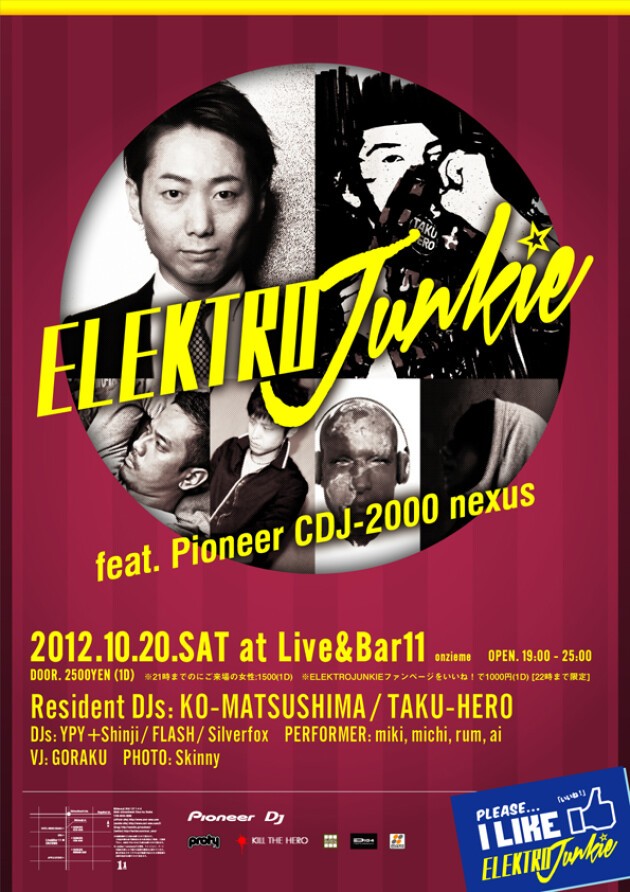 ※フェイスブックのELEKTROJUNKIEファンページを「いいね」して、携帯スマフォに画像をダウンロードし、当日フロントで提示していただくと1000円(2D)でご入場!(22時まで限定)さらに先着順でノベルティプレゼントもあり!