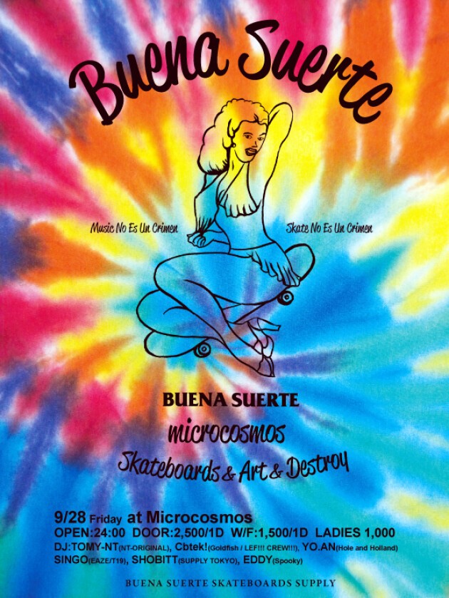 毎週木曜日、渋谷AMRAXにて行われているフロアにミニランプを設置しているスケートクラブイベント。海外スケーター来日の際のデモンストレーション や、映像作品のプレミア上映会なども展開し、スケーターのみならず感度の高い人々を巻き込んだ、新たなムーヴメントを巻き起こしている。そのBUENA SUERTEのDJ陣が、音のみのパーティーをしたいと言い出し「micro cosmos」で今回開催!DJ陣には、LEF!!! CREW!!!のメンバーでもありスケーターのCbtek!をはじめとして、TOMY-NT、YO.AN、SINGOなど、スケートボーダーが中心となり 開催します。
