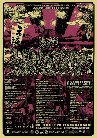 なにわサイケデリック・トランスの文化を壊したくない一心で、新世界の名を背負い、大阪発の老舗パーティー「NEWWORLD」の16周年!大阪に残された大自然の中、紅葉を眺めながら音楽、芸術、食の文化交流が出来れば最高な事になると考えています。色々あった2012年本州最後の野外フェスです、大人のルールを守り、みんなで「ええやないか」しましょう。