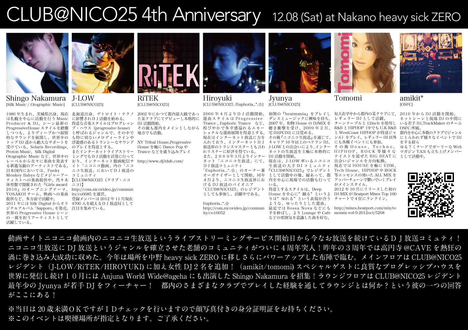 メインフロアはCLUB@NICO25レジデント(J-LOW/RiTEK/HIROYUKI)に加え女性DJ2名を追加(amikit/tomomi)