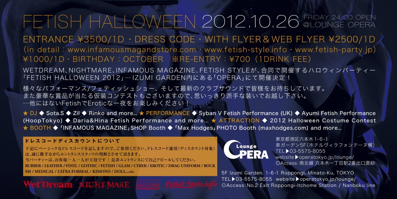 Wet Dream(TGJ PRODUCE)、Nightmare(TGJ PRODUCE)、INFAMOUS MAGAZINE、FETISH STYLEが、合同で開催するハロウィンパーティー 「FETISH HALLOWEEN 2012」、IZUMI GARDEN内にある「OPERA」にて急遽開催決定!