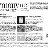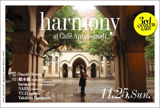 2009年秋に始まった「harmony」ですが、おかげさまで、三周年を迎えることとなりました。ニュー・ディスコ/リエディットと共振するかのような昨今の「harmony」ですが、スタートのきっかけは、カフェ・アプレミディのCD棚にMental Remedyのレコードがディスプレイされていたことでした。NYハウスは、「harmony」を語る上で避けて通ることはできません。今回のゲストDJは、前回に引き続き、Dazzle Drums。NYハウス・セットです。前回「harmony」で、台風直撃の中、鬼神のような凄みあるプレイを見せつけた二人を見逃し、悔しい思いをした方も少なくないはず。「harmony」第21回、三周年の夜を一緒に楽しみましょう!