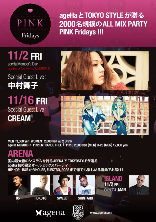 ageHa史上、最強のALL MIXナイト、PINK Fridays!ヒット曲満載のアリーナは毎回盛り上がり必至!Youtubeチャンネルが1000万ビューを超える、今話題のアーティスト、CREAMがスペシャル・ライブを披露!外国人ダンサー自慢のGO GO DANCEショー、華麗なPOLE DANCEも楽しめちゃう。女性入場料は、2,000円で2ドリンク付き!
