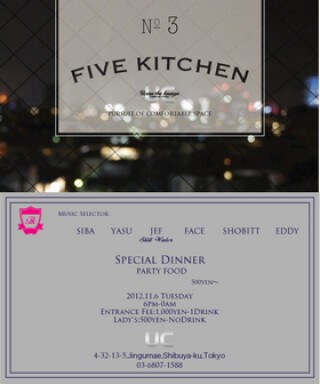 毎回イベントの内容で変わるMusic Selector今回も色々な所で活躍しているDJ人がFIVE KITCHENに集結。今回もどんなスパイスで空間演出をするのか楽しみである。