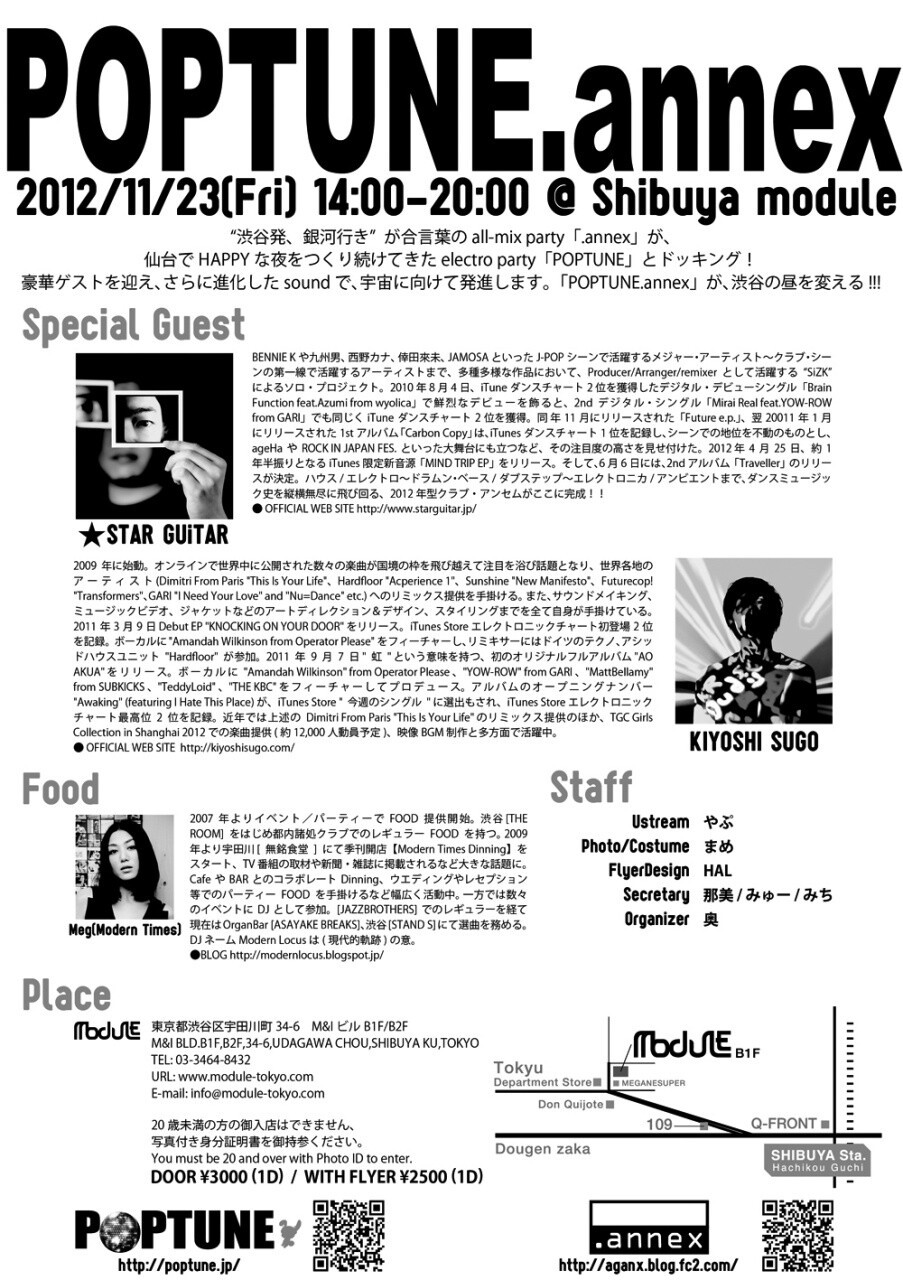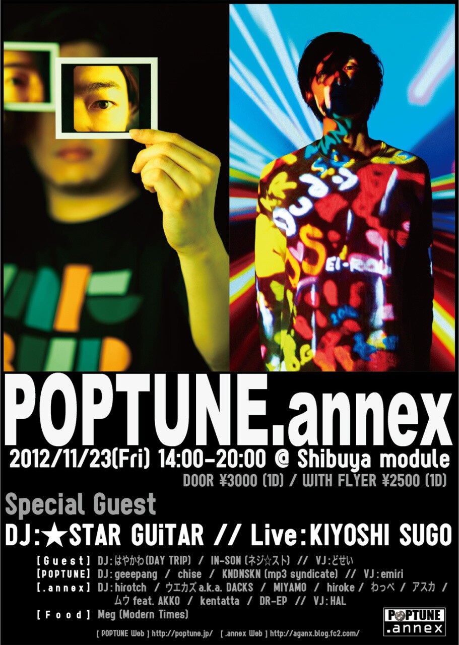 “渋谷発、銀河行き”が合言葉のall-mix party「.annex」が、仙台でHAPPYな夜をつくり続けてきたelectro party「POPTUNE」とドッキング! 豪華ゲストを迎え、さらに進化したsoundで、宇宙に向けて発進します。「POPTUNE.annex」が、渋谷の昼を変える!!!