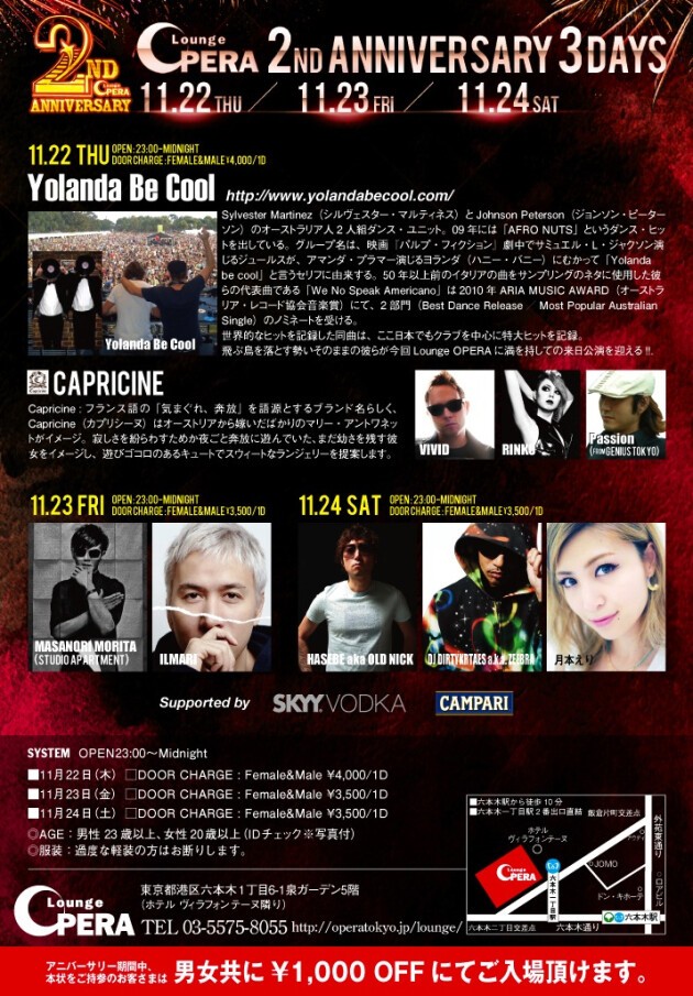 数々の有名DJ、ゲストを迎えておくる、LoungeOPERA 2nd ANNIVERSARY PARTY 3DAYS!! 初日の祝前日、11/22(Thu)には”We No Speak Americano”の特大ヒット、CRYSTAL WATERSを迎えた”Le Bump”も絶好調なYolanda Be Coolの来日が決定!!