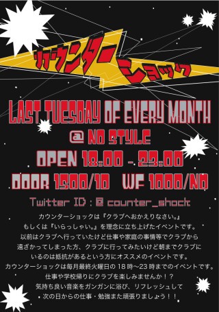 カウンターショックは平日火曜の18時〜23時までのイベントです。仕事、学校帰りにクラブを楽しみませんか!?気持ち良い音をガンガンに浴びてリフレッシュしてください。そして次の日からのパワーを充電してください