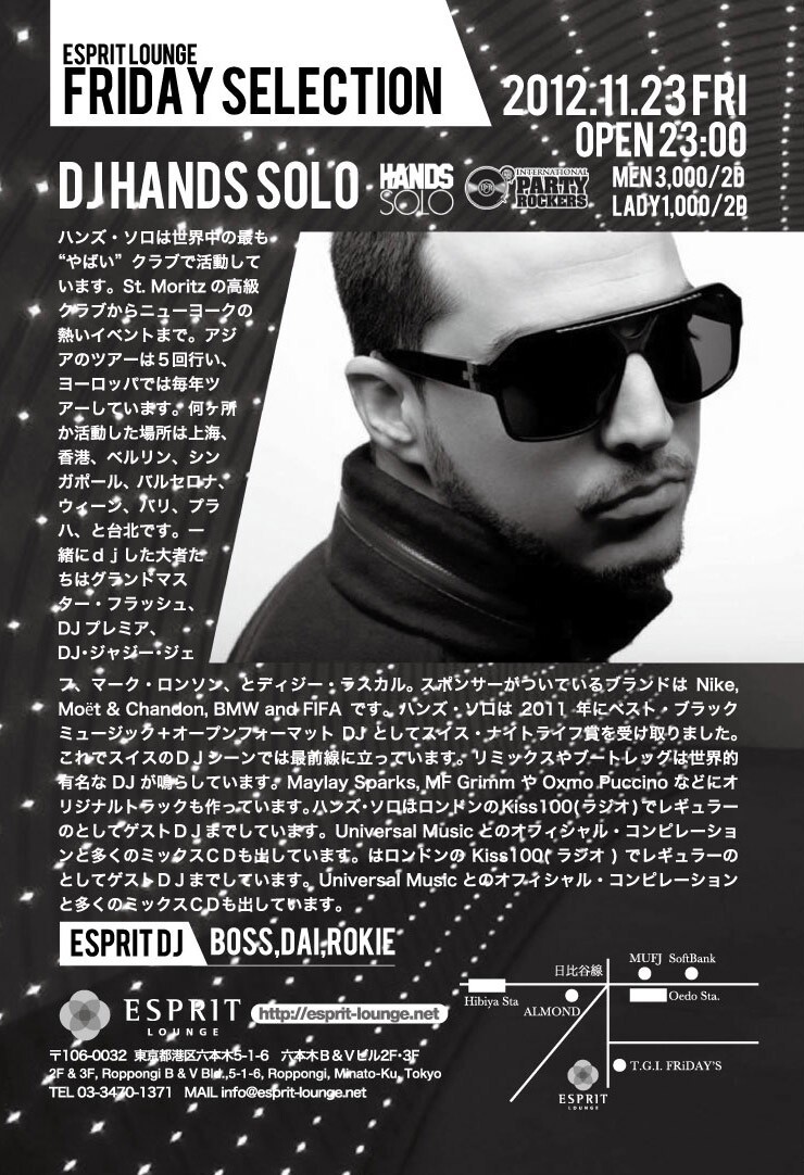 ハンズ・ソロは世界中の最も“やばい”クラブで活動しています。St. Moritzの高級クラブからニューヨークの熱いイベントまで。アジアのツアーは5回行い、ヨーロッパでは毎年ツアーしています。何ヶ所か活動した場所は上海、香港、ベルリン、シンガポール、バルセロナ、ウィーン、バリ、プラハ、と台北です。一緒にdjした大者たちはグランドマスター・フラッシュ、DJプレミア、DJ・ジャジー・ジェフ、マーク・ロンソン、とディジー・ラスカル。 スポンサーがついているブランドはNike, Mo?t & Chandon, BMW and FIFAです