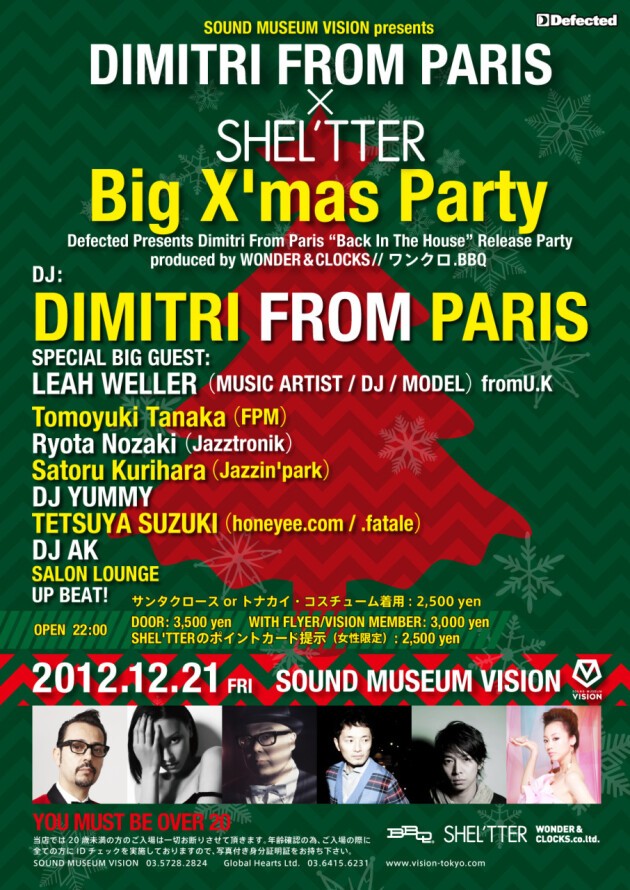 きらびやかでエキサイティングなクリスマス・パーティの開催が決定した。今回登場するのは、クラブ・シーン?ファッション/セレブ業界を自在に飛び越え、常に最新モードを生み出すトレンドセッター:ディミトリ・フロム・パリ。今年9月にDefected Recordsの看板作品「Back In The House」をリリースした彼が、クリスマス仕様のスペシャルDJセットを披露する。さらに、ザ・ジャムのフロントマンとして世界的栄光を掴んだUKのロックスター、ポール・ウェラーの愛娘であり、ミュージシャン/モデル/DJとしての顔を持つ才女:リア・ウェラーもゲスト参加。また、田中知之(FPM)や野崎良太(Jazztronik)なども出演を果たす。そして当日は、女性から絶大な支持を得るファッション・ブランド:SHEL'TTERがコラボレーション。ディミトリ、リア・ウェラー、そしてSHEL'TTERが“特別なクリスマス・プレゼント”を贈る。