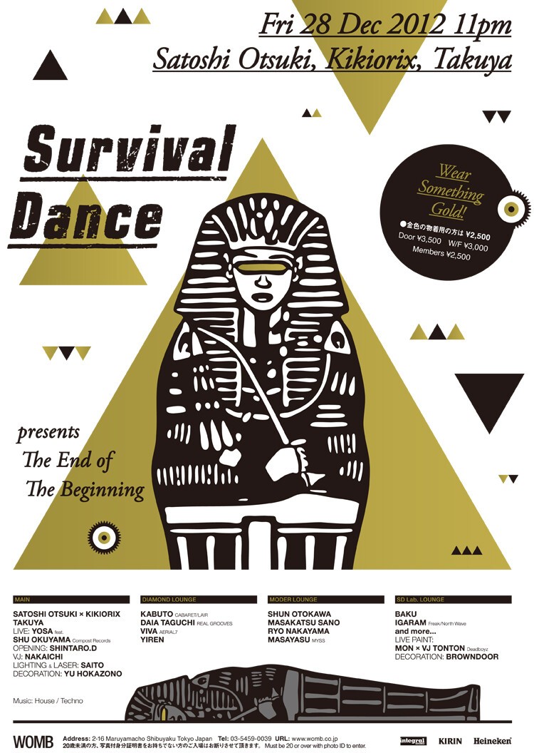 ローンチから2年半。長きに渡ってマンネリ状態にあったシーンに新たな時代の到来を予感させたことは、非常に大きな成果である。だからこそ僕にとっては、SURVIVAL DANCE におけるオーガナイザー3人の目的は、おおよそ達成されているかのように思えていたのだ。しかし次回、2012年12月28日(金)の開催に銘打たれたタイトルはなんと、"The End Of The Beginning"。「始まりの終わり」、である。そこで僕は、彼らが抱く野望の大きさを、そもそも見誤っていたことに気が付く。SURVIVAL DANCE にとって、ここまではあくまで序章。次回を一つの区切りとし、今後はアジア進出を視野に入れた次の展開に進んでいくという。