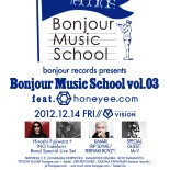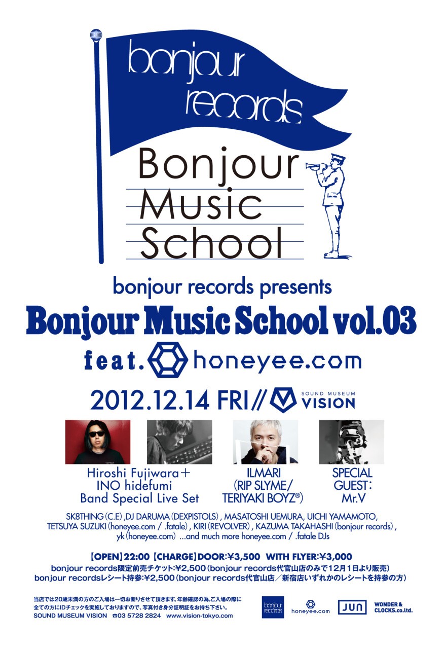 これまでにフランスの21世紀型マルチ・カンパニー:Kitsun?からジルダとマサヤ、そして現行エレクトロニック・ミュージック界の頂点に立つボーイズ・ノイズが出演し、強烈なインパクトを残したbonjour recordsのオフィシャル・パーティ『Bonjour Music School』。その第三弾は、ファッション・カルチャーを基盤に、国内外のカッティングエッジな情報を伝えるウェブマガジン「honeyee.com(ハニカム)」とコラボレーションを果たす。アコースティックセットでのライヴ活動が盛んな藤原ヒロシが、この日、猪野秀史とともにフルバンドでのライヴを披露するほか、ILMARIや瀧見憲司、DJ DARUMAなどハニカムと親交の深いアーティストやクリエイターが集結。さらには、ユニット/ソロ両方で音楽活動を展開するほか、国内外のファッション界でも絶大な支持を獲得するマルチアーティストが、Mr.Vとしてゲスト参加。音楽、ファッション、アート、食文化など、様々なカルチャーがエキサイティングに融合する。
