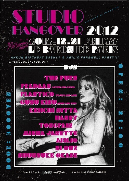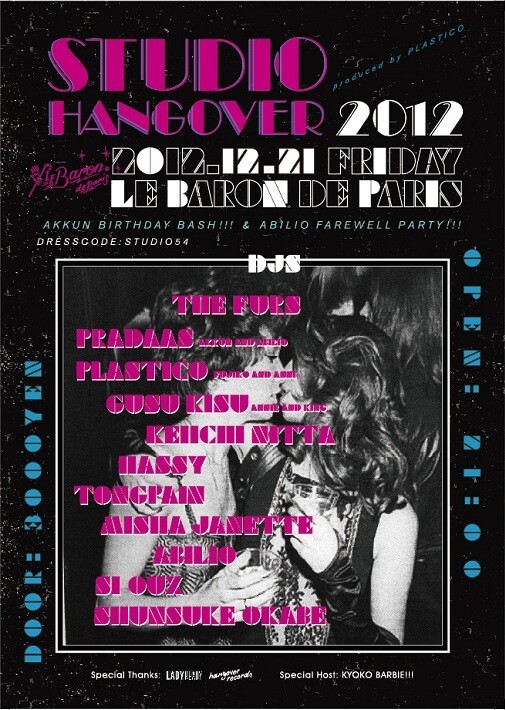 10代後半から尖ったファッションで日本のファッションシーンを渡り歩き、プラダのVMDという大任を務めながら、Le Baron de Paris発祥のパーティー集団YOUNG LOVERSの創設メンバーとして数多くのパーティーにDJ出演を果たしてきたアビリオ・マルセロ・萩原。世界各国のファッションパーティーに召喚される国産美男美女DJユニットTHE FURSのAKKUN。強烈にフォトジェニックな男2人をゲストに迎え、アビリオのNYへの旅立ち、そして年齢不詳なAKKUNの誕生を祝して、今夜は盛大なパーティーを開催します。ドレスコードはSTUDIO 54。強烈な皆さんのご来店、心よりお待ちしております。