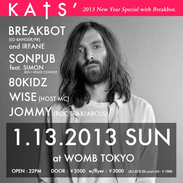 2013年発目のKATS'は、ED BANGER RECORDSより2012年9月に待望のデビューアルバム「BY YOUR SIDE」をリリースしたばかりのBREAKBOTを迎え、KATS' 2013 New Year Special with BREAKBOT.と題して開催します