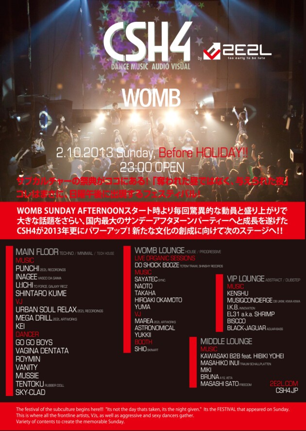 WOMB SUNDAY AFTERNOONをスタート時より牽引し、国内最大のサンデーアフタヌーンパーティーへと成長を遂げたCSH4が祝前日の日曜日にスペシャルパーティーを開催!!