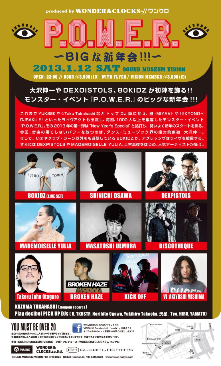 これまでYUKSEKや☆Taku TakahashiなどトップDJ陣に加え、雅-MIYAVI-や!!!KYONO+DJBAKU-!!!といったライヴアクトも出演し、毎回、1000人以上を集客したモンスター・イベント『P.O.W.E.R.』。その2013年の第一弾は“New Year's Special”と銘打ち、勢いよく新年のスタートを飾る。今回、音楽の果てしないパワーを放つのは、ダンス・ミュージック界の絶対的象徴:大沢伸一。そして、いまやクラブ・シーン以外をも遊撃している80KIDZが、アグレッシヴなライヴを披露する。さらにはDEXPISTOLSやMADEMOISELLE YULIA、上村真俊をはじめ、人気アーティストが集う。