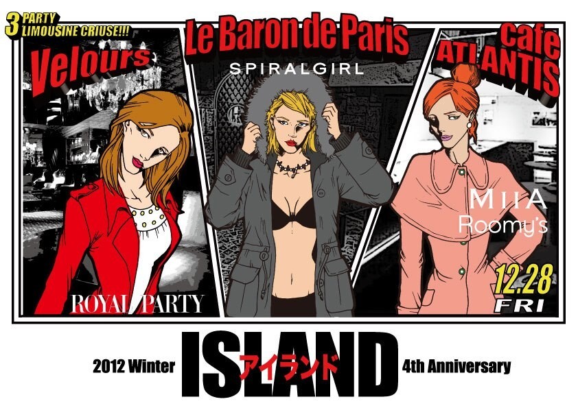 <ROYAL PARTY>、<SPIRALGIRL>、<MIIA>、<ROOMY’S>と、都内最大級のラウンジイベントを主催するISLAND の4周年記念パーティーを、青山を代表するナイトスポットLe Baron de Paris、Velours、そしてcafe ATLANTISで同夜開催! Le Baron de Paris では<SPIRALGIRL NIGHT>、Velours では<ROYAL PARTY NIGHT>、そしてcafe ATLANTIS では <MIIA & ROOMY’S NIGHT>を開催します。Le Baron de Parisでお配りするリストバンドを着けていれば、他2会場でのパーティーにフリーアクセスでき、また豪華リムジンで会場を回遊することも可能。極楽島をアイランドホッピングするように、一晩で3ヶ所、4つのパーティーをお楽しみ下さい。さぁ、みなさん!準備は良いですか?今夜は是非、Le Baron de Parisを出発点に、ISLANDが企画するナイトクルージングにご参加ください!