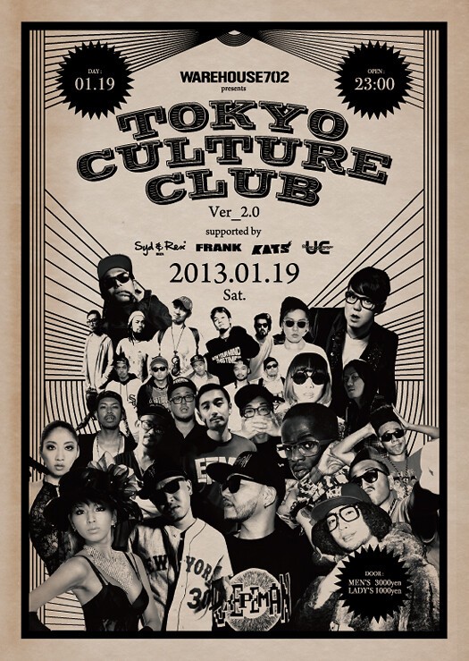 2012年春、東京のカルチャーを五感で体感させた「TOKYO CULTURE CLUB」。まさに伝説の一夜となったこのパーティーがここに蘇る。東京を代表し成長を続けるパーティー「KATS’」(キャッツ)、原宿の夜を彩る「UC」、そして世界のカルチャーを席巻する「FRANK」がタッグを組んだ他、「Syd&Rex」が完全サポートする今回のTOKYO CULTURE CLUBは、オープンからラストまで、2DJ's + MC + DANCEという今だかつてないスペシャルな構成でこの日を演出。これこそ音楽的異種格闘技戦とも言える予測不可能な一夜になることマチガイナシ。