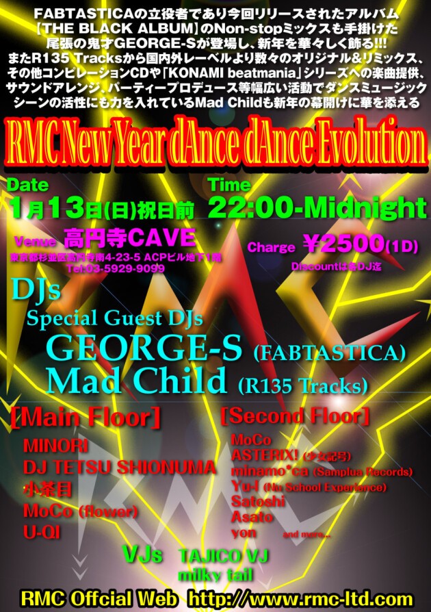 またR135 Tracksから国内外レーベルより数々のオリジナル&リミックス、その他コンピレーションCDや「KONAMI beatmania」シリーズへの楽曲提供、サウンドアレンジ、パーティープロデュース等幅広い活動でダンスミュージックシーンの活性にも力を入れているMad Childも新年の幕開けに華を添える
