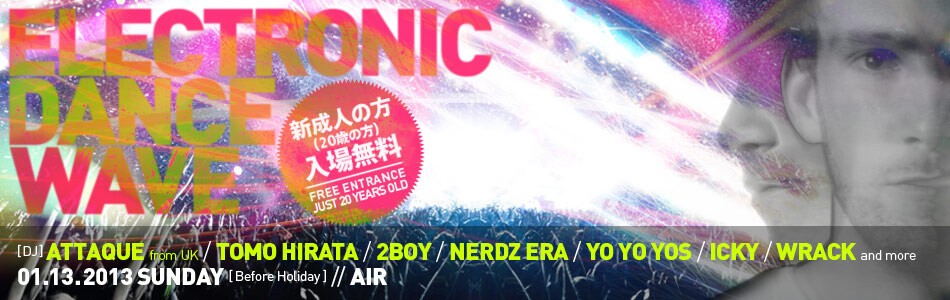 2013年成人式前夜、この日AIRに新たなトライアルパーティが始動する。"ELECTRIC DANCE WAVE"。移り変わるダンスミュージックシーンの中でクラウドを激しく煽動する新しいエレクトロニックなサウンドを提案する。メインアクトには海外からスペシャルなゲストアーティストをフィーチュアする。胸躍るアーティストの発表はAIRホームにて。そしてエレクトロ以降のシーンをパンキッシュかつロマンティックに彩るDJスタイルで人気の2BOYと主催パーティ”THIRTEEN”クルーがサポートを務める。新成人の来場者には特別料金が設定されているので、クラブデビューにも最適な一夜となる。