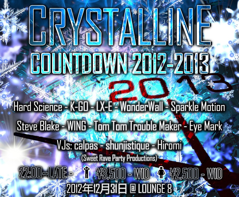 DJs from across Tokyo are joining forces to create a countdown party of unsurpassed quality, with a premium music selection you won't find at any other countdown party in this city, complete with a top-notch sound system, stunning visuals, and an unbeatable atmosphere complete with lasers, crystal decor, a snow machine and more!