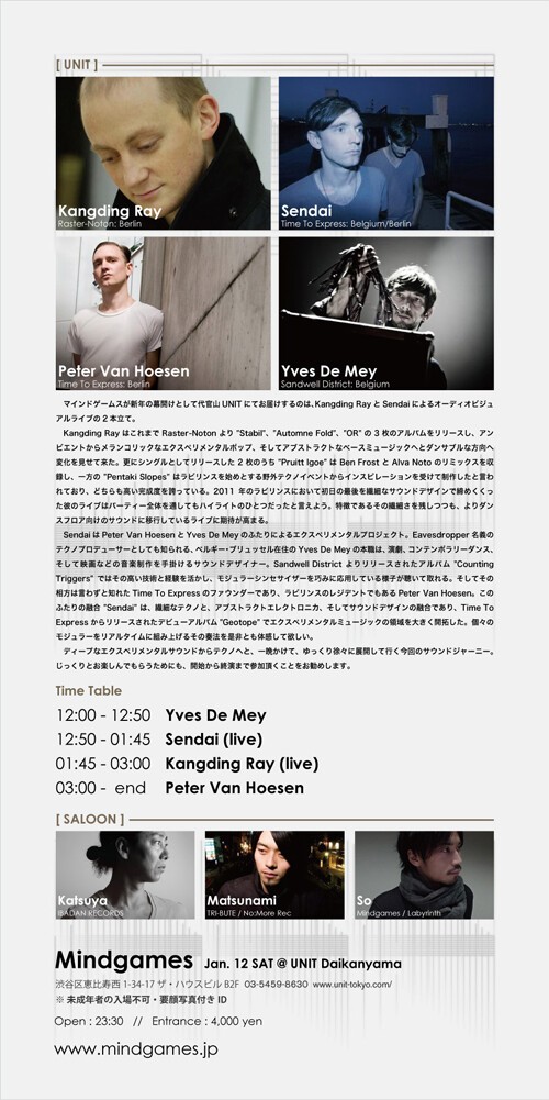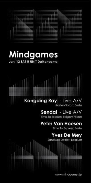 マインドゲームスが新年の幕開けとして代官山UNITにてお届けするのは、Kangding RayとSendaiによるオーディオビジュアルライブの2本立て。