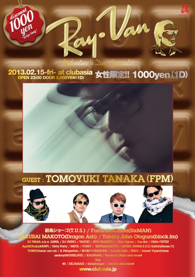 FLOOR LINE UPには、スクラッチ、二枚使いを交えた独特のELECTRO/DISCOミックスで定評のある副島ショーゴ、都内各所で疾走感のある黒いテクノサウンドを響かせているFumihiko Chiba、説明不要のモンスターバンドDragon AshからSAKURAI MAKOTO、block.fmや都内各パーティーで大・大・大活躍中のTakeru John Otoguro、彼らを中心に、今最も旬なDJ陣が渋谷clubasiaに集結。良質なダンスミュージックをお届けする“Ray-Van” お見逃し無く。
