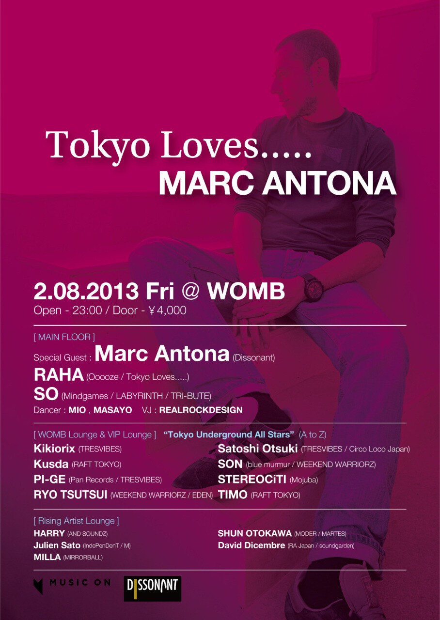 And now, we are proudly present that this will be the kickoff of the new party by “Tokyo Loves.....”. ?We've put our hearts into bringing carefully selected guests to Tokyo, here amidst our feelings of loving admiration. This time our first guest is Marc Antona!