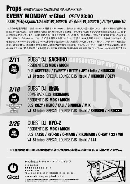 EVERY MONDAY CROSSOVER HIP HOP PARTY !! "Props"いよいよ始動です!!!!