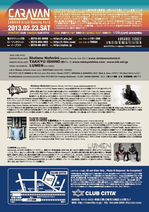 川崎最大のイベント施設【 CLUB CITTA' 】にて、Techno/House/Tech House系BIG PARTY【 CARAVAN 】が2月23日(土)にスタートする。