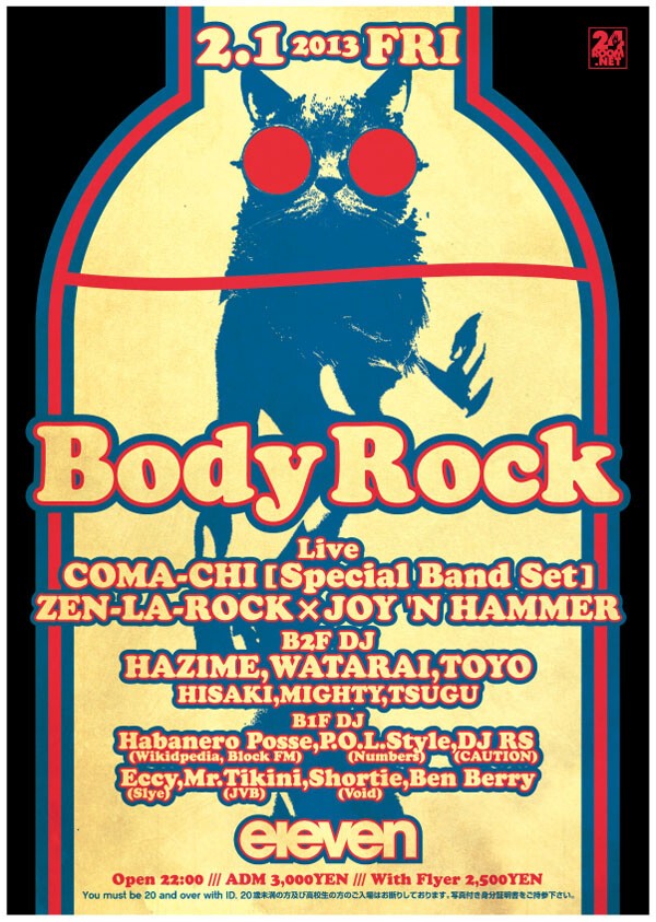 ヒップホップ、R&Bはもちろん全てのグッドミュージック&ライブでお届けする『Body Rock』。B2Fメインフロアではライブになんと今回スペシャルバンドセットでの登場となるCOMA-CHIに加え、ワンコインシングル『ICE ICE BABY』も好評なZEN-LA-ROCK × JOY 'N HAMMERが登場!さらにDJ陣にはHAZIME、WATARAI、TOYOを中心に思わず体を揺らしてしまうであろうHOTでHOTな一日を演出します。これでもまだ物足りないなんていう贅沢なあなた!ご安心ください。階段をチョット上がるだけでHabanero Posse、P.O.L.Styleを中心としたDJ陣が時には激しく、時には優しく。そっと皆さんを包んでくれる事でしょう。ここelevenでこの時期中々かけない汗をかき、笑顔で帰宅し寝床につくのも悪くはないのでは!?