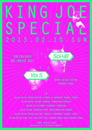 2013年第1回目のSOI 48は大阪から日本のガレージシーンの王様KING JOE氏をスペシャル・ゲストに招いて開催します。ガレージのスペシャリストKING JOE氏ですが最近アジア、南米のガレージはもちろん辺境系にも夢中だとか?!世界のロックと歌謡曲中心で回すスペシャル・セットは必見!!