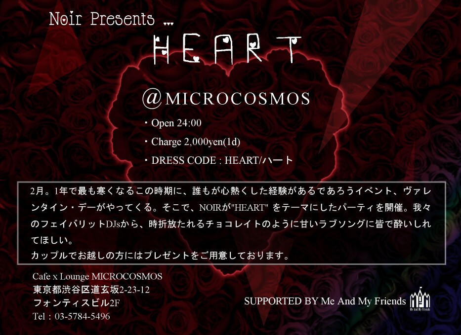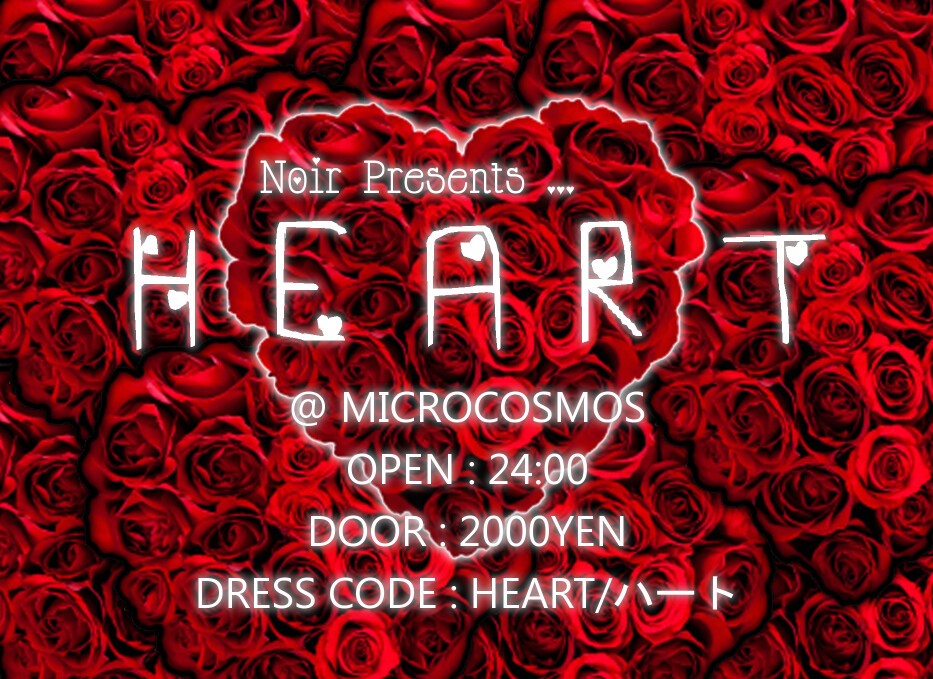 2月。1年で最も寒くなるこの時期に、誰もが心熱くした経験があるであろうイべント、ヴァレンタイン・デーがやってくる。そこで、NOIRが"HEART" をテーマにしたパーティを開催。我々のフェイバリットDJsから、時折放たれるチョコレイトのように甘いラブソングに皆で酔いしれてほしい。