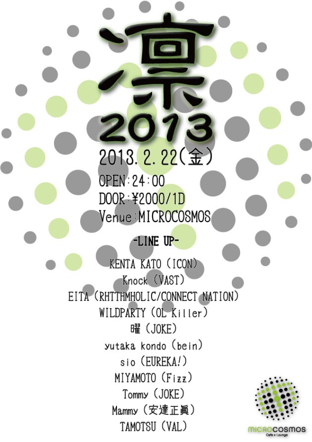 2007年まで青山VALで開催されていたアットホームパーティー、”凛”。惜しまれつつ幕を閉じたこのパーティーから巣立っていったDJ達は今もなおシーンを揺るがし続けている 。その凛が、この日オールスターメンバーを集結させ、渋谷MICROCOSMOSで一夜限りの復活!持ち前のアットホームさは勿論、シーンの最前線で活躍するDJ達の化学反応にも多いに期待をしてほしい。