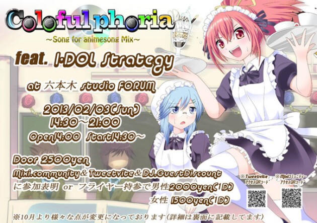 ☆TRANCEやHARD、TECHNOやHOUSEまで生粋のCLUBSOUNDを発信し続けるCLUBイベント界の老舗、TCPTが打ち出すアニソンクラブイベント『colorfulphoria』 原曲アニソンアンセムからマニアックなアニメソング、アーティスト、声優ソングまでを網羅し、個性的なDJがそれぞれの色を出し望む。 アニソン好き!ヲタ芸好き!打ち師!声優現場系!コスプレイヤー!すべてにおいてDDの方!楽しんでくれる方誰でも大歓迎!! アニソン好きだけど、CLUB系のイベントってどうなの!?..... 周りにクラブイベント行く人いないしそれでも楽しいのかな.... 最近どこのアニクラ行ってもかかってる曲一緒じゃない? 原曲でも、作品アルバムOP/EDシングルのC/Wなんかも聞きたいよ! アーティストや声優の他の曲も流ないかな?? なんて、おもっちゃってる皆様方!! カラフォリは多ジャンルの原曲大多数、むしろほぼ原曲のアニメ好きやLive好きに大変優しい仕様になっております!! なので、そんな思いをお持ちの皆様も絶対楽しいよヽ(゚∀゚ノ)イ゛ェヤー!! 今回は今年1発目のカラフォリ!!! っと言っても2月ですが・・・ 今回whitefloorには 渋谷 amate-raxiで毎回満員御礼のParty感満ち溢れるイベントを行なっている A-HOL!Cから変幻自在のプレイを奏でアニソンから声優アーティスト選曲まで自由自在に使いこなすDJ 祖師谷太郎!! そして、奈々オンリーや作曲者オンリーなど知識や選曲の深さで勝負なイベントもそつなくこなすDJ ねーしょん!! 何気A-HOL!C陣営でカラフォリ最多出演!!今やタンテプレイヤーとして実力を発揮するDJきんたま乱太郎が参戦!!! 更に今回は「最高金賞をあなたに」で一世風靡した 吉祥寺Club SEATAで開かれていたあのアニソンプレミアムからDJ星くじら、DJtSuk@が参加!! 一風変わった選曲やDJStyleは必見です!! アニメソングを中心に皆様が最高に滾れるプレミアムな時間を提供します。 ※今回の特集コーナーは『ゆいかおり』です!! そして blackfloor では ColorfulPhoria Side Storyとして10月に発起した 2次元&3次元アイドルクラブイベント I-DOL Strategy が帰ってきた!! 今や、国民的アイドルと言う言葉が飛び交う昨今、アニメのテーマソングをアイドルさんが歌ったり、 アイドルのアニメが制作されたりアイドル声優なるものが出てきたりと、まさにアイドル戦国時代!! 世間ではアニメとアイドルの境界線もあまりなくなってきている様な気がします!! 今回は1フロアでの開催のため2Dアイドルも3Dアイドルも1フロアで楽しめます!! DJ陣も個性満載のラインナップ!! コアなアイドル、有名な国民的アイドル、もちろん2Dではアイマスやラブライブ等も流れますよ! もうすっかりお馴染み!広く綺麗な六本木のステージ『studio FORUM』の日曜アフタヌーンパーティーでアニソン三昧しちゃいましょう!!