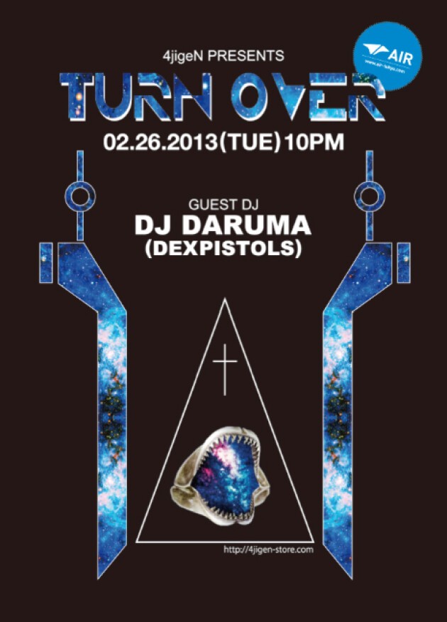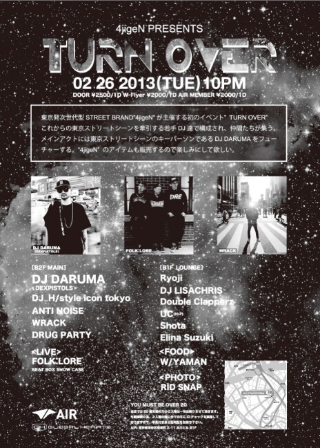 東京次世代型STREET BRAND"4jigeN"が主催する初のイベント”TURN OVER”。これからの東京ストリートシーンを牽引する若手DJ達で構成され、仲間たちが集う。メインアクトには東京ストリートシーンのキーパーソンである