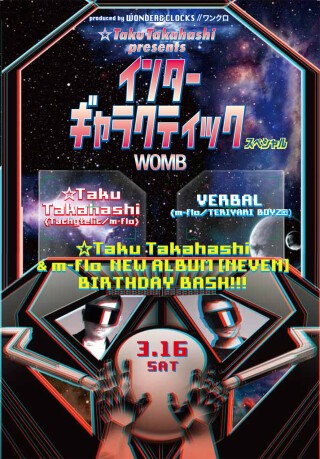 これまでに中田ヤスタカ、DAISHI DANCE、大沢伸一といったトップ・アーティストをゲストに迎え、いまやWOMB随一のモンスター・パーティとなった☆Taku Takahashiによる『インターギャラクティック』。その第四弾が☆Taku Takahashi本人の誕生日直前に、スペシャル・バージョンとして開催されることとなった。今回、彼とともにクラウドを熱狂させるのは、音楽?ファッション界で絶大な支持を得る21世紀型マルチ・アーティスト、VERBAL。つまり、m-floの両雄がエキサイティングな共演を繰り広げることとなった。しかも、m-floは待望のニューアルバム「NEVEN」を3月13日にリリースことが決定。その新曲を交えた☆Taku Takahashiの最新のセットや、『インターギャラクティック』限定のサプライズな企画が飛び出すかも!? ☆Taku TakahashiとVERBAL、この2人が生み出す音楽の流星群のなかへ、いざ突入!