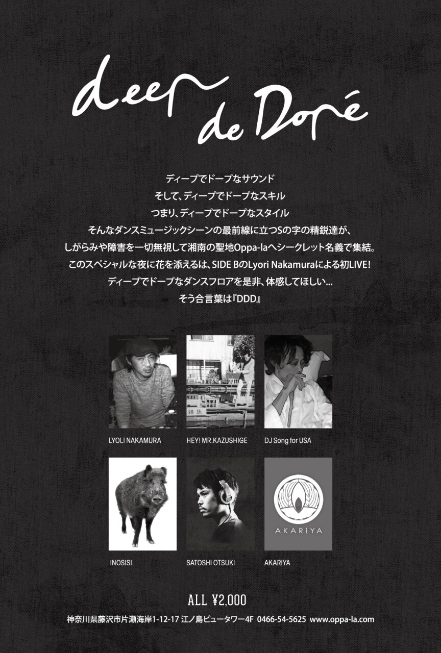 そんなダンスミュージックシーンの最前線に立つSの字の精鋭達が、しがらみや障害を一切無視して湘南の聖地Oppa-laへシークレット名義で集結。